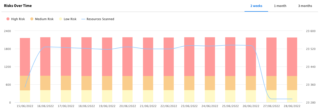 You can see the risk trends over time. The line represents the number of resources scanned. The bars show the number of risks per time block and are broken down in colors by severity.